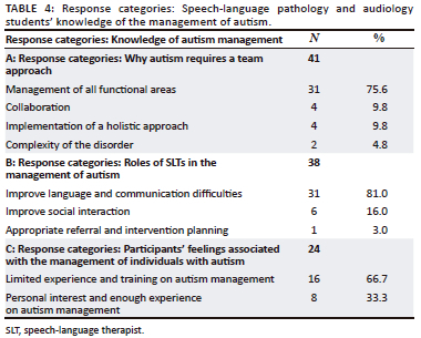 The results for the three open-ended questions related to the qualitative domain for Objective 3 are integrated and presented in Table 4. The response categories for these questions are summarised and presented. Some responses are not reflected in the response categories because of the participants' inability to answer the specific questions; for example, 27% (n = 11) of the participants answered the questions with a 'yes' or 'no', although they had to provide a reason or opinion. The response categories to the open-ended questions related to the 'importance of a team approach', the 'roles of SLTs in the management of autism' and 'participants' feelings associated with the management of individuals with autism' are summarised in Table 4. Some participants either answered the question inadequately or left the question unanswered.