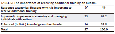 Only 37 participants answered the open-ended question. The results reflect that 62.2% (n = 23) highlighted that additional training on autism would enhance knowledge and improve competence in assessing and managing the disorder, and 8% (n = 14) of the participants indicated that additional training would increase their knowledge holistically. Hence, the most prominent theme from the identified categories was that training would lead to 'enhanced proficiency' in the holistic management of individuals with autism. Therefore, the theme validates the quantitative findings for Objective 4.