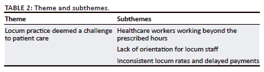 RESULTS: Locum practice was characterised by challenges related to healthcare workers working beyond the prescribed hours, a lack of orientation for locu staff, inconsistent locum rates, and delayed payments. The consequences of these challenges are compromised quality and safety of patient care