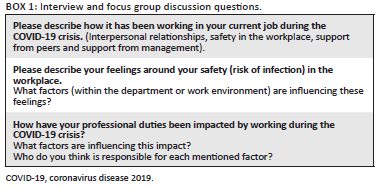 After ethics and gatekeeper permissions were granted, the interview and FGD guides were pre-tested by the researcher among participants who did not take part in the final data generation. Because of COVID-19 regulations, data were generated virtually and telephonically between May and September 2021 using a multi-method approach comprising semi-structured one-on-one interviews with 13 participants in the first phase (n = 13) and two FGDs (n = 2) constituting five and six participants each in the second phase. This allowed for the simultaneous capture of individual perceptions of eThekwini-based frontline radiology caregivers' experiences as well as the ability to discuss work-related issues that individuals might fear to share in fear of victimisation (eds. Bauer & Gaskell 2000:48). Interview invitations were circulated among the population through their heads of departments (HODs). The invitations included information advising individuals to express their interest in participating in the study by either informing their HODs or emailing the researcher directly. The pre-tested interview and FGD guides comprised open-ended questions (Box 1), which were developed by interlinking the research study's aim and research questions to enable a comprehensive exploration of the frontline radiographers' experiences.
