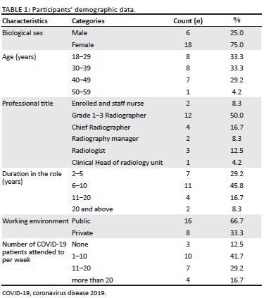 Most of the participants were working in public radiology departments, identified as female, and were in the age range 18 years - 49 years (Table 1). Grade 1-3 radiographers made up most of the sample, which also comprised four chief radiographers, two radiography managers, two radiology nurses, and four radiologists. The majority of the participants had 6 years - 10 years' work experience within their roles, with the most experienced participants having more than 20 years. Many of the participants attended to COVID-19 patients with some attending to more than twenty COVID-19 patients per week.