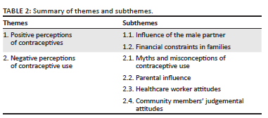 The participants described positive and negative perceptions of contraceptive use. The positive perceptions included the prevention of pregnancy when male partners do not support the use of condoms, and pregnancy prevention when there are financial constraints in families. Negative perceptions of contraceptive use were associated with myths and misconceptions, fear of parental retribution, healthcare worker judgemental attitudes and community member attitudes. The themes and subthemes are summarised in Table 2.