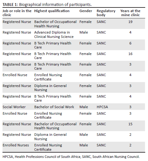 Table 1 outlines the biographical information of participants, which includes their years of work experience at the mine clinic, registration with regulatory professional bodies and their highest academic qualifications. The participants who took part in the study were 13 whereby 9 were females and 4 were males. Furthermore, among the 13 respondents, 8 participants had speciality in their qualification, while 5 had basic qualifications. The years of experience of participants as ON's at the mining sector is as follows: 9 participants had less than 5 years of experience, 1 participant had more than 5 years of experience, while 3 participants had more than 10 years of experience in the mining sector.