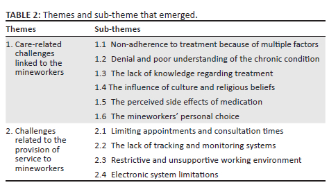 Two overarching themes as well as various sub-themes emerged from the data analysis. Theme 1 - Care-related challenges linked to the mineworkers, had six sub-themes, namely non-adherence to treatment because of multiple factors, denial and poor understanding of the chronic condition, the lack of knowledge regarding treatment, influence of culture religious beliefs, perceived side effects of medication and mineworkers' personal choice. Theme 2 - Challenges related to the provision of service to mineworkers and had four sub-themes, namely limiting appointments and consultation times, the lack of tracking and monitoring systems, restrictive and unsupportive working environment, and electronic system limitations (see Table 2).