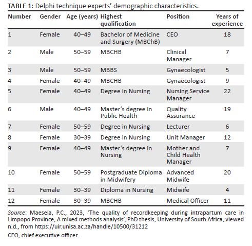 Table 1 reflects the demographic characteristics of the Delphi technique participants.