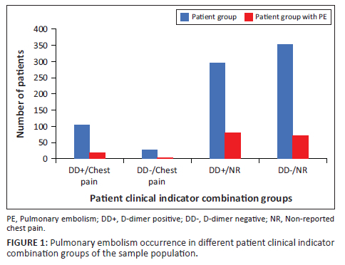 In the research setting, the standard protocol for the workup for patients with suspected thrombosis involves performing D-dimer tests routinely; patients with elevated D-dimer levels and chest pain are then sent for CTPA. The researcher noticed that, during the COVID-19 pandemic, there was an increase in the number of patients with positive D-dimer tests and chest pain being sent for CTPA. The number of patients who underwent CTPA and who were retrieved from the Picture Archiving and Communications System (PACS) was substantially more for the 2020 year of COVID-19 (n = 813) than the number of patients in 2019 (n = 666), 2018 (n = 580) and 2017 (n = 551) (PACS, accessed 13 February 2021). A review of the PACS data indicates that few of these patients were ultimately diagnosed with PE. This observation - that patients with elevated D-dimer levels who underwent CTPA did not have PE - indicates that referral for CTPA should not be based solely on increased D-dimer levels. This approach is questioned, as CTPA could give rise to excessive radiation exposure, allergic reactions to CM and contrast nephropathy and place a significant financial burden on both the patient and the healthcare system (Sun & Lei 2017). This begs the question, What is the relation between increased D-dimer levels and CTPA confirmation of PE? This study was, therefore, undertaken to establish the relationship between elevated D-dimer levels and positive CTPA for all patients with chest pain and suspected PE.