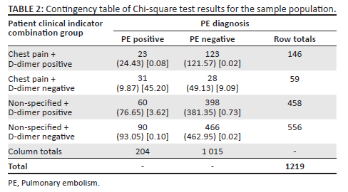 A Chi-square test of independence was performed to establish if different patient groups, classified in terms of combinations of clinical indicators with positive or negative PE diagnosis, were related. The test revealed significant results at α = 0.05 (χ2 [3, N = 1219] = 58.85, p < 0.0001). Table 2 provides a contingency table of the Chi-square test and shows the different clinical indicator groups and PE diagnosis. Four clinical groups, each with a different combination of D-dimer positive or D-dimer negative with either positive or negative PE diagnoses, were subjected to a Chi-square test of independence to determine whether a relationship existed between D-dimer levels and PE diagnoses. According to the results of this test, a significant relationship between the different categories at α = 0.05 (χ2 [1, N = 995] = 1.84, p = 0.175) could not be established.