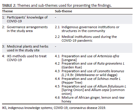 The findings of this study reveal that most respondents demonstrated a significant understanding of COVID-19, and the measures put in place by government to curb the spread of the virus. With regard to participants' understanding of the COVID-19 pandemic, the findings are comparable to the findings of other studies (see Amentie et al. 2022; Opoku, Aboagye & Ernest 2021). In rural areas with limited access to conventional healthcare facilities and vaccines (Ola 2022), participants primarily rely on indigenous medicinal plants for the prevention and treatment of COVID-19 symptoms. The reliance on traditional remedies was not only made a necessity because of a lack of access to conventional health facilities but also shows deep-rooted cultural practices within the community. Knowledge of traditional medicine is deeply embedded in the social and cultural capital. The pride and ownership that respondents expressed in using traditional medicine underscore the importance of IKS in building social cohesion, especially during times of uncertainty.