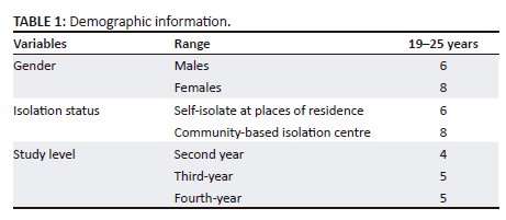 The study consisted of 14 participants, six were males and eight were females. Their ages ranged from 19 years to 25 years. Four students were in the second year level, five in the third-year and five in the fourth-year level of nursing training. Eight participants tested positive for the COVID-19 virus in 2020, while six tested in 2021, only one tested positive in 2020 and again in 2021. Eleven of the participants indicated they lived with three to 11 family members in their houses, whereas three lived alone in the university hostel and rented rooms. None of the participants was hospitalised during the COVID-19 treatment but eight were admitted into community-based isolation centres, while the other six were instructed to self-isolate at their places of residence. Table 1 shows the demographic information of participants.