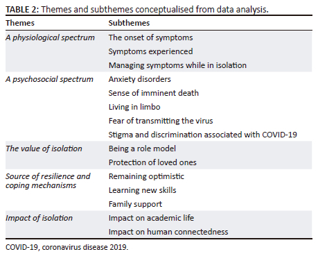 RESULTS: Five themes that emerged from data analysis are the physiological spectrum, psychosocial spectrum, the value of isolation, source of resilience and coping mechanisms and the impact of isolation.