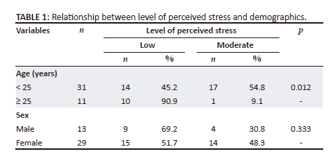 In the study involving 42 students, 24 (57.1%) displayed low levels of perceived stress and 18 (42.9%) exhibited moderate levels. Notably, no students reported experiencing severe stress symptoms. The association between the level of perceived stress and demographics is shown in Table 1. Participants who were 25 years and younger had a considerably higher likelihood of experiencing moderate symptoms of perceived stress compared to those who were 25 years and older (54.8% versus 9.1%, p < 0.05). No significant relationship between levels of perceived stress and sex (p > 0.05) was found, but females (48.3%) were experiencing more moderate symptoms of perceived stress than males (30.8%).