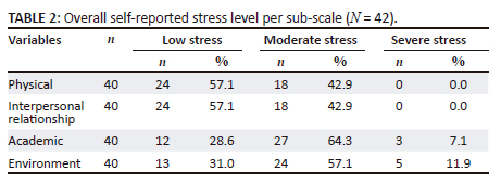 RESULTS: The median age of participants was 22 years (iqr ± 3.8) with 69.0% of them being females. Perceived stress levels ranged between low (n = 24, 57.14%) to moderate (n = 18, 42.85%) with females being at risk, as measured by the Student Stress Inventory. Academic and environmental factors contributed to perceived moderate to severe stress levels.