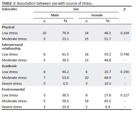 To ascertain the factors that contribute to the level of stress, the items were summed up within each subscale for each participant. Therefore, subscale scores falling within the range of 10 - 18 indicate a low degree of stress, scores between 19 and 29 suggest a moderate level of stress and scores between 30 and 40 indicate a severe level of stress. The Cronbach alpha coefficients for each subscale were as follows: 0.99 for physical, 0.72 for interpersonal relationship, 0.85 for academic and 0.81 for environment.