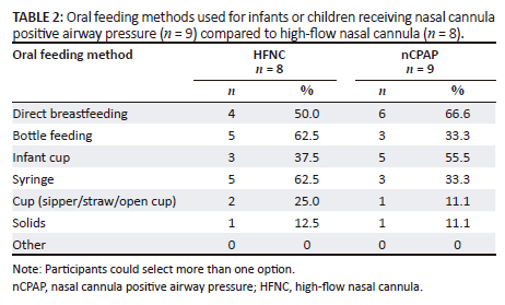 Participants were asked about factors influencing decisions not to administer oral feeds to infants and children on nCPAP and/or HFNC. Five out of 15 (33.3%) reported that they never administered oral feeds on nCPAP, although they did not specify the rationale for this decision. Only one participant (7.0%) indicated that infants and children receiving HFNC were never provided with oral feeding because of the aspiration risk associated with this practice. Methods of oral feeding on nCPAP and HFNC are presented in Table 2. Only nine participants completed this question.