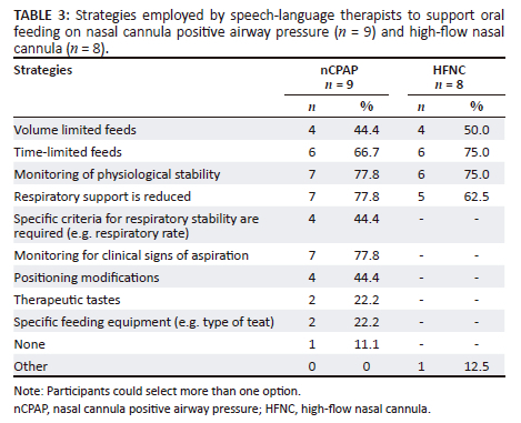RESULTS: Of 21 responses, only nine were fully complete, indicative of how few South African SLTs work with infants on high-flow oxygen. Current oral feeding practices varied with differences between nasal continuous positive airway pressure (nCPAP) and high-flow nasal cannula (HFNC). Strategies for oral feeding included volume and time limitations, monitoring physiological stability and assessing for aspiration. Thin liquids were most commonly used. Varied opinions, with no protocols or guidelines for introduction of oral feeding of young children on high-flow oxygen, are reported.