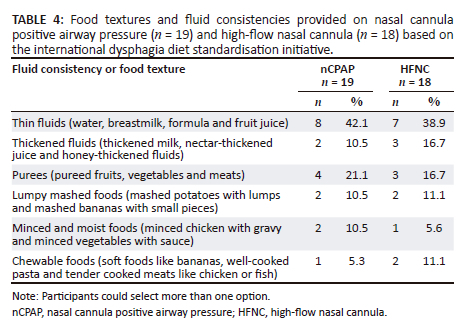 Participants described consistencies provided to infants and young children receiving nCPAP and HFNC from a specified list described according to the International Dysphagia Diet Standardisation Initiative [IDDSI] (Table 4). Thin liquid was most frequently provided for both patients on nCPAP (n = 8; 42.1%) and HFNC (n = 7; 38.9%). Nineteen participants answered this question.
