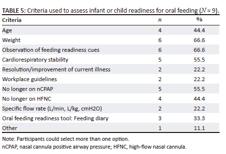 The majority of the sample of nine participants emphasised the importance of observing feeding readiness cues (n = 6; 66.7%), highlighting the importance thereof in assessment (Table 5).