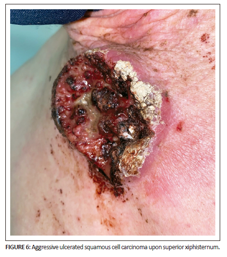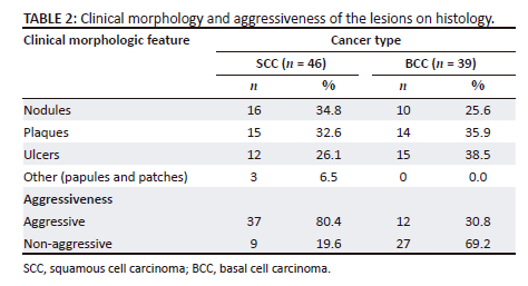 The clinical morphology of the lesions was recorded as nodules, plaques, ulcers or other (papules and patches). Histological changes were categorised as aggressive or non-aggressive. The authors defined the aggression of skin cancers as follows: