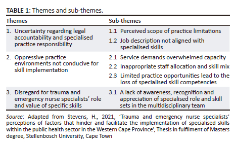 Ten participants were interviewed, with six from the tertiary hospital and four from the district hospital. Three themes captured the perceived barriers to specialist skill implementation: Uncertainty regarding legal accountability and specialised practice responsibility, oppressive practice environments not conducive to skill implementation and disregard for trauma and emergency nurse specialists' role and value of specific skills. Themes and sub-themes are presented in Table 1.