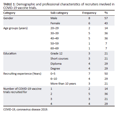 The study population consisted of 14 fieldworkers and community recruiters from six clinical research sites of two research organisations in the eThekwini District, KwaZulu-Natal, whose primary role was recruiting participants for COVID-19 vaccine trials. Inclusion criteria required participants to have at least 3 months of experience in COVID-19 vaccine trial recruitment in the district, be willing and able to provide informed consent and be involved in either completed or ongoing COVID-19 vaccine trials.