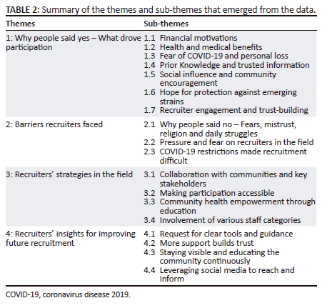 The 14 recruiters in this study represented a diverse group of individuals, many of whom had years of experience in participant recruitment for research. Most were in their 30s and 40s, with qualifications ranging from diplomas to degrees, and half had worked in recruitment for more than 6 years. Beyond these details, however, their lived experiences reveal the human realities of recruitment during a pandemic: resilience, pressure and emotion while navigating an extraordinary global health crisis. From their narratives, four central themes emerged, shedding light on what it meant to be on the frontlines of clinical trial recruitment during the COVID-19 pandemic: why people agreed to participate, the barriers recruiters encountered, the strategies they used to overcome those barriers and recruiters' reflections and recommendations for the future.