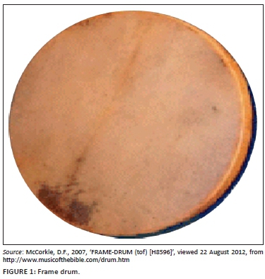 The frame drum is regarded as 'one of the most popular instruments in ancient Israel' (Kolyada n.d.:109).23 For the purpose of this contribution, attention is being given to the drum24, bearing in mind the significance of the drum in Africa, as well as in the Old Testament. The importance of the drum/frame drum is clearly acknowledged in the text of the Old Testament25, as is clear form the following two examples26: