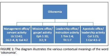 In the use of οἰκονομία in Ephesians there are several possible uses. Hoehner (2002:217) identifies two possible meanings, the 'first, the position or office of an administrator; second, the activity of administrating'. The term οἰκονομία is used by Paul in different contexts with a specific nuance that is determined by the particular context (Figure 1). In order to determine the nuanced meaning intended in Ephesians more is required than simply making a decision between which one of two possible usages, 'administrative office' or 'activity', is meant. The particular meaning in the context has to be determined1. 'It is the setting of words, rather than the words themselves, which forms the vital contribution to New Testament thought' (Black 1988:138). It has been recognised that 'a word can be used in a multiplicity of ways' (Louw 1982:54), and that: