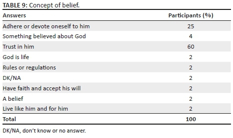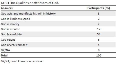 The three qualities of God favoured by the participants are related to his power, ability to create and act, as shown in Table 10. The concepts of reigning or revelation were not highly prioritised amongst the participants' choices. The FG showed how communities consider God to be present everywhere (omnipresence), how he can be trusted and because he cares, protects and helps, he is an innovative being. His presence is related to states and values such as hope, light, peace, nobility, simplicity, salvation, mercy and tolerance. In a participant's words, God 'to me is love, peace, kindness, glory' (Focus group 3).