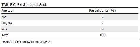 Most of the population stated that God exists, as shown in Table 6. This conviction was provided through various factors such as family influence, an act of faith related to the creation of everything that exists, the different manifestations of the deity or even, as stated by one participant, health in times of sickness: