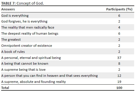 Who is God? When faced with this question, most people associated the concept with a personal, eternal and spiritual being or with a supreme reality; somehow, a metaphysical view prevailed, as shown in Table 7. In addition, a high percentage of the participants imagined God as a tangible, sensitive or material person. During the interviews, particular images of God related to affective bonds were highlighted: God as father, friend or teacher.