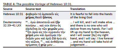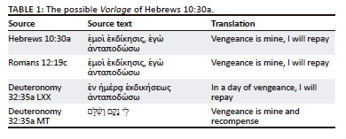 The text quoted in Hebrews 10:30a and Romans 12:19c differs from Deuteronomy 32:35a in both the LXX and MT, as can be seen in Table 1.