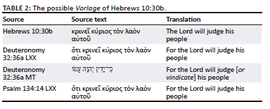 The source of the second quotation is easier to determine than that of the first: it either comes from Deuteronomy 32:36a LXX or Psalm 135:14 (134:14 LXX), as can be seen in Table 2. The fact that a version of Deuteronomy 32:35a is presumably quoted in Hebrews 10:30a strengthens the probability that the author quotes Deuteronomy 32:36a in Hebrews 10:30b (Allen 2008:60).