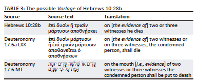 The severity of the judgement under the old covenant is stressed by the use of the verb 'die' (ἀποθνῄσκω) in combination with the prepositional clause 'without pity' (χωρὶς οἰκτιρμῶν), and the confirmation that this judgement takes place upon the 'evidence of two or three witnesses'. While other possible Vorlagen have been suggested, including Deuteronomy 19:15 and Numbers 35:30, the wording of Deuteronomy 17:6 forms the closest parallel with Hebrews 10:28 (as can be seen in Table 3), and consequently, various scholars view the latter as an allusion to the former (cf. Allen 2008:75-76; Steyn 2007:159).