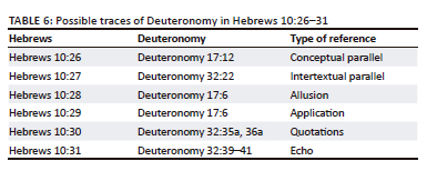 As argued above, not all these traces of Deuteronomy are equally convincing. The author's quotations of Deuteronomy 32:35a and 32:36a in Hebrews 10:30, allusion to Deuteronomy 17:6 in Hebrews 10:28 and echo of Deuteronomy 32:39-41 in Hebrews 10:31 are explicit references to the Book of Deuteronomy. Less likely, but still a possibility, is the author's application of Deuteronomy 17:6 in Hebrews 10:29. While the conceptual parallel between Numbers 15:30-31 and Deuteronomy 17:12 in Hebrews 10:26 and the intertextual parallel between Isaiah 26:11 and Deuteronomy 32:22 in Hebrews 10:27 can be confirmed, it is difficult to prove that the author deliberately (albeit indirectly) referred to these passages from Deuteronomy for the sake of his argument.