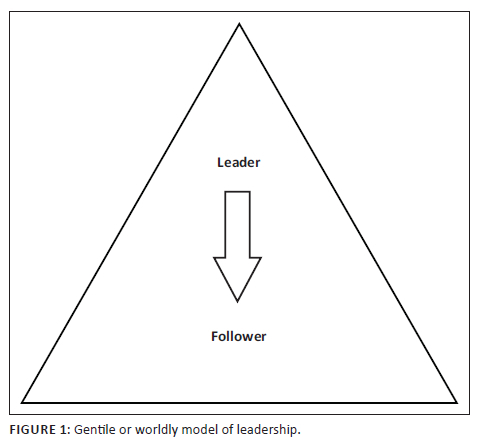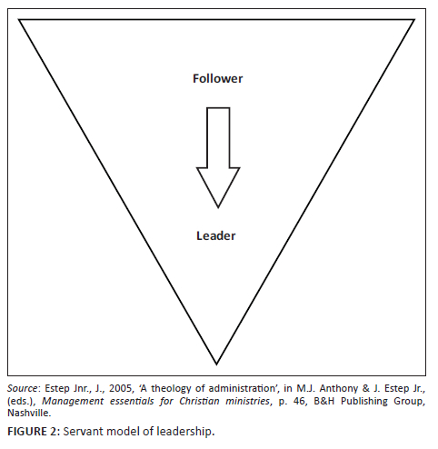 Finally, servant leadership is 'supportive, with authority at the bottom of the pyramid and followers being served by the leader and subject to the nurturing oversight of the leader', as opposed to worldly leadership that is 'suppressive with authority [concentrated] at the top of the hierarchy and followers being lorded over and dictated to by those in authority' (Estep 2005:46; cf. Figure 1). This principle derives from Jesus' teaching about leadership in Mark 10:35-45.