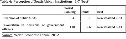 This has led to widespread favouritism and corruption in the decision making system. This has emerged during court cases and investigations. The scale of it is captured by various international organisations, such as, Transparency International and the World Economic Forum. According to Transparency International, South Africa ranks 84 on the world's Corruption Perception Index. The World Economic Forum also scores South Africa dismally in relation to other countries with regard to favouritism in decision making and diversion of public funds (Table 4).