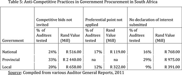 Of greater concern is that the amounts presented in Table 5 are from a very small sample, and that the figure for the total government procurement is likely to be more than three times greater. The other issues relating to the current preferential procurement practices in South Africa are the lack of information and transparency. Moreover, there is no dedicated mechanism to challenge an award of a contract or any dispute settlement mechanism for government procurement. This makes it difficult for competitors to query or monitor unfair practices facilitating corruption.