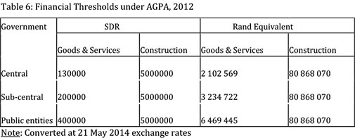 The above discussion does not imply, however, that South Africa is prepared to fully liberalise its markets. It is important for South Africa to take advantage of the provisions of S&D treatment for developing countries in the form of transitory offsets to develop its industry, regions, and sections of society. The AGPA provides for financial limits below which the Members are not compelled to invite international price competition (Table 6) and this will restrict competition to Small, Medium and Micro-Enterprises (SMMEs) and protect the Broad-Based Black Economic Empowerment (BBBEE) firms.
