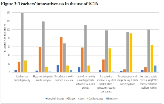 Figure 3 illustrates the findings from the survey questions probing teachers' degree of innovativeness in using ICTs.