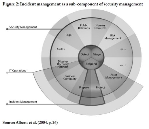 Figure 2 (from Alberts et al., 2004) shows how incident management forms a sub-component of security management. Incident management establishes and maintains capabilities such as patch management, configuration management, and security policies. These capabilities are utilised (not established) by incident management to accomplish its goals.