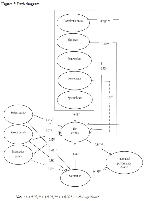 In the second stage, the study assessed the structural model using the same model fit indices used in the assessment of the measurement model. The assessment of the structural model yielded the following goodness of fit: x?/df = 2.267, RAMSEA = 0.083, GFI = 0.870, CFI = 0.940, and TLI = 0.976. The model fit indices indicate that there is an adequate structural fit between the hypothesised model and the observed data. The explained variance (R2) in use is 63.2% and in individual performance is 68.4%, suggesting that the model has good explanatory power as compared to similar studies and is good enough to produce substantial effects (Cohen, 1988). Results of hypothesis testing and the resulting path diagram are provided in Table 5 and Figure 2, respectively.