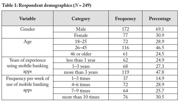 Table 1 provides demographic information-gender, age, years of experience using mobile banking apps, and frequency per week of use of the apps-for the 249 respondents.