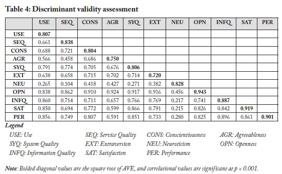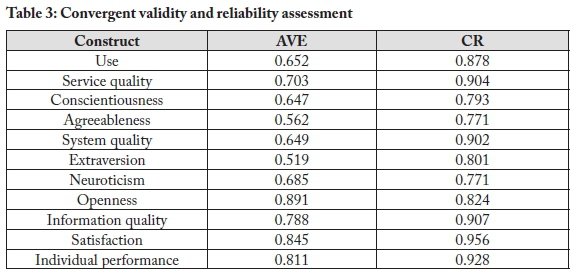 Convergent and discriminant validity was used to assess the measurement model and composite reliability (CR) was used to assess reliability. Table 3 indicates the results of convergent validity and reliability assessment. The results of convergent validity indicate that the average variance extracted (AVE) values for the constructs are great than 0.5, implying that the measurement items for each construct are theoretically related to each other (Fornell & Larcker, 1981) and the values for composite reliability are all above 0.7, implying that the measurement items have met the reliability threshold (Nunnally & Bernstein, 1994).