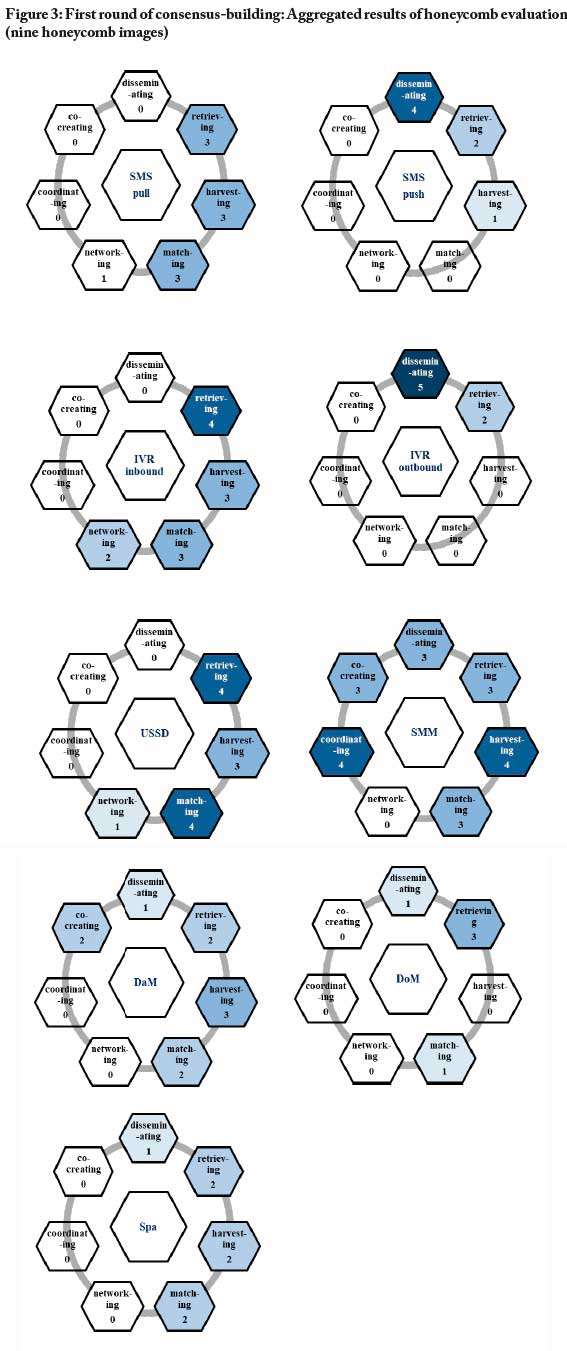 The first round of the expert consensus-building, with the four-person internal panel of experts, collated views on the intermediation capability (high to low) of each ICT identified in the Ghanaian agricultural system (see Figure 3). In terms of the ICTs with a high capability to support intermediation capabilities (ranking > 3), the aggregated results of the honeycomb evaluation show that interactive voice response (IVR) outbound technologies were viewed as having very high capability to support disseminating, and IVR inbound technologies were viewed as having high capability to support retrieving. In addition, short message service (SMS) push technologies were seen as having a high capability to support disseminating, and unstructured supplementary service data (USSD) technologies were viewed as having a high capability to support retrieving and matching. Furthermore, the aggregated results showed that social media messaging (SMM) technologies had a high capability to support harvesting and coordinating, and an intermediate capability to support all the other intermediation capabilities, excluding networking.