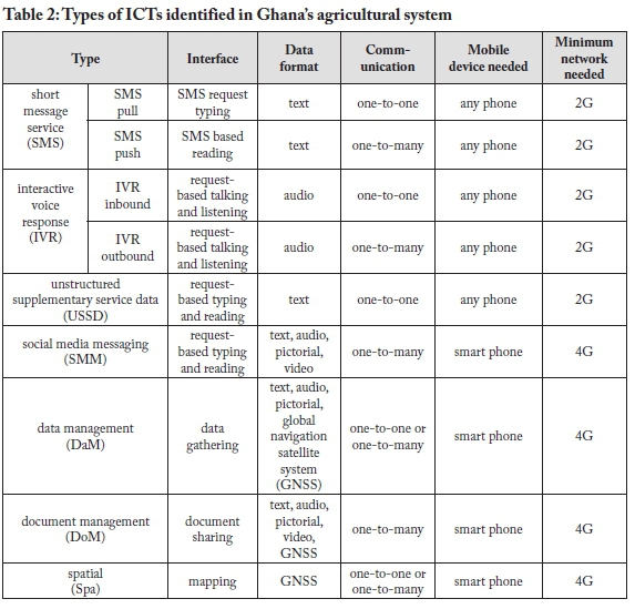 At the same time, Ghana is a key African player in the innovative use of digital information and communication technology (ICT) (GSMA, 2019). Digital ICTs are now central to most spheres of development (Sein et al., 2019; United Nations, 2020), as represented by the ICT for development (ICT4D) discipline, which is focused on "the application of any entity that processes or communicates digital data in order to deliver some part of the international development agenda in a developing country" (Heeks, 2017, p. 10). Among the key ICTs and ICT-enabled services harnessed for developmental purposes are interactive voice response (IVR), short message service (SMS), unstructured supplementary service data (USSD), social media (e.g., WhatsApp, Facebook), and document and data management systems (e.g., Open Data Kit). Such ICTs and ICT-enabled services present new opportunities for connectivity and information sharing to enhance communication-related service delivery (Bell, 2015; Gershon & Bell, 2013). Therefore, these technologies are being explored by scientists, researchers, and development practitioners to respond to the limitations of classical approaches to extension and interaction in Ghana's agricultural system (Cieslik et al., 2018; Fielke et al., 2020; Gakuru et al., 2009; MEST, n.d.; Qiang et al., 2012).