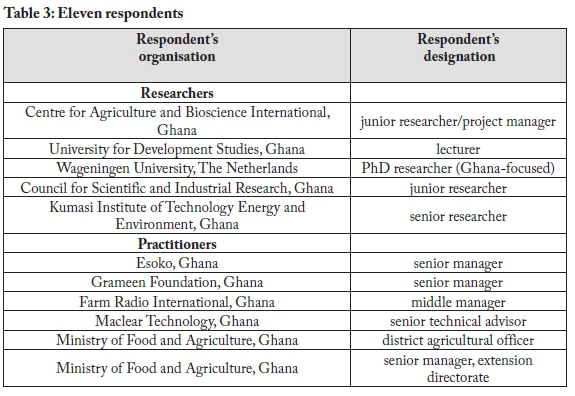 In total, 22 potential respondents-13 researchers and nine ICT4Ag practitioners- were identified and sent an email invitation to engage in the study by completing the online questionnaire, which was administered via the web-based platform Google Forms. Of the invitees, 11 (five researchers and six practitioners-see Table 3) responded to the questionnaire during the two-week period given for responses.