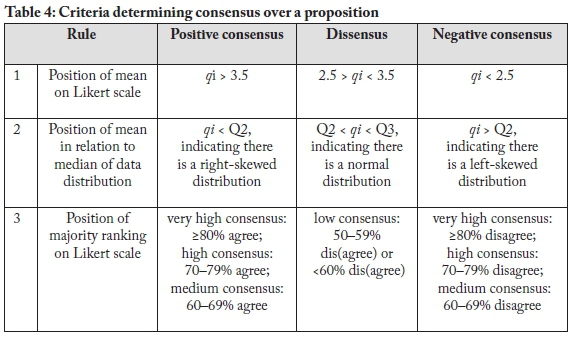 For round two, the descriptive statistics analysed for each proposition included the mean (qi), the median (Q2), and the frequency of ranking for each point on the Likert scale. Based on these statistics, we determined whether there was positive consensus (agreement) or negative consensus (disagreement) about a proposition, or whether there was dissensus (varied ranking or polarisation) about a proposition. We considered three criteria to determine whether consensus was reached and to determine the direction of the consensus for each proposition (Table 4). These criteria were (1) the position of the mean on the Likert scale (Chu & Hwang, 2008); (2) the position of the mean in relation to the median in the data distribution (Chu & Hwang, 2008); and (3) the significance of the percentage of participants ranking a proposition on the Likert scale, ranging from low to medium to high to very high (Doria et al., 2009; Hasson et al., 2000).