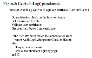 The information flow of the blockchain-based audit log model is illustrated in Figure 7. The data flow diagram is based on Figures 3 and 5. The audit log data flow diagram omits the authentication and authorisation process to simplify the diagram. The process assumes that a user has been authenticated. When a user attempts to execute an operation on the EHR system, an event is triggered, which sends metadata to the client. Metadata could include details such as the actions performed by a user on an object and the result of the performed actions. The metadata is sent from the client to the peers in the blockchain network. At a later stage, authorised auditors can request the audit log from the EHR system. The audit log could also be used by doctors to validate the integrity of EHR data in their possession. Figure 8 outlines pseudocode to retrieve an audit log by range. Figure 9 provides pseudocode to append an audit log entry to a blockchain network.