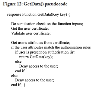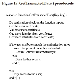 The TransactData method in Figure 14 outlines pseudocode to transact data between organisations that are part of the blockchain network. Retrieving transacted data could be achieved with the pseudocode function presented in Figure 15.