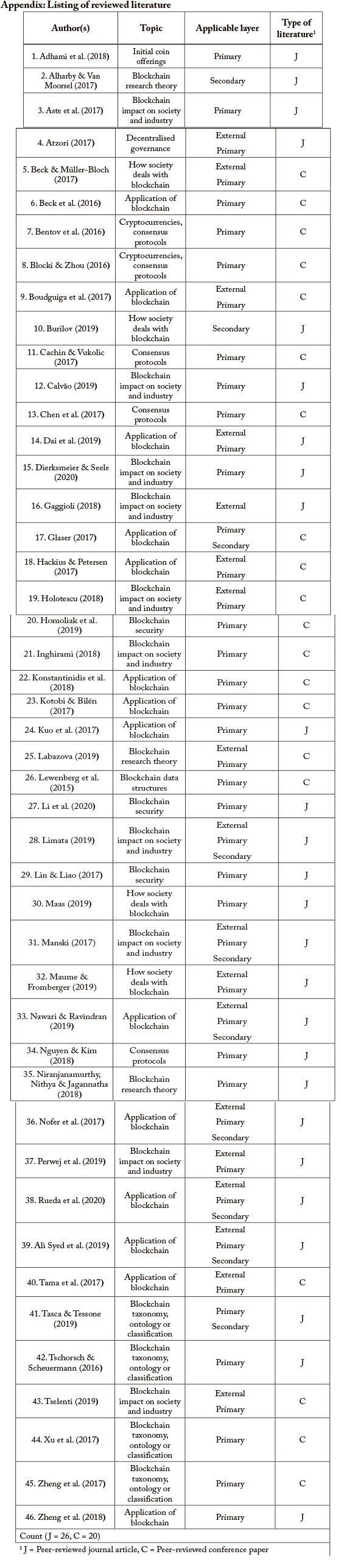 Each item identified in the literature was studied to determine which aspects the au-thor(s) ascribed to the term decentralised in the context of a permissionless blockchain system. In some of the material set aside for further analysis, the authors' treatment of the term decentralised was too vague to warrant including it in the study. Eventually, of the 89 articles and papers identified for detailed scrutiny, 46 (see Appendix) were included in the results. At this point, we concluded that it was unlikely that additional interpretations of the term decentralised were forthcoming by including more material, and that the disqualified material up to that point did not include any information that was not present in the final 46 articles and papers.